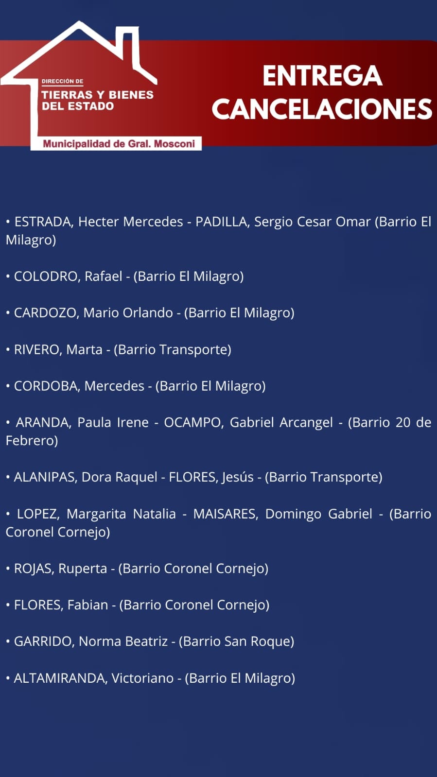 La Dirección de Tierras y Bienes del  Estado de nuestro Municipio,  informa que el día Lunes 19 de Enero del 2026, se procederá a realizar el Acto de Entrega y Firma de Escrituras de vecinos pertenecientes a diferentes barrios de nuestra localidad.