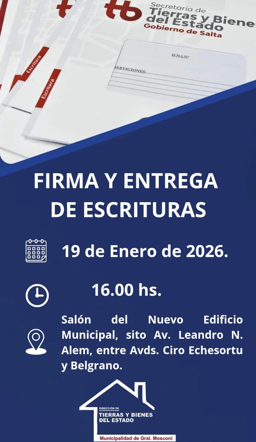 La Dirección de Tierras y Bienes del  Estado de nuestro Municipio,  informa que el día Lunes 19 de Enero del 2026, se procederá a realizar el Acto de Entrega y Firma de Escrituras de vecinos pertenecientes a diferentes barrios de nuestra localidad.