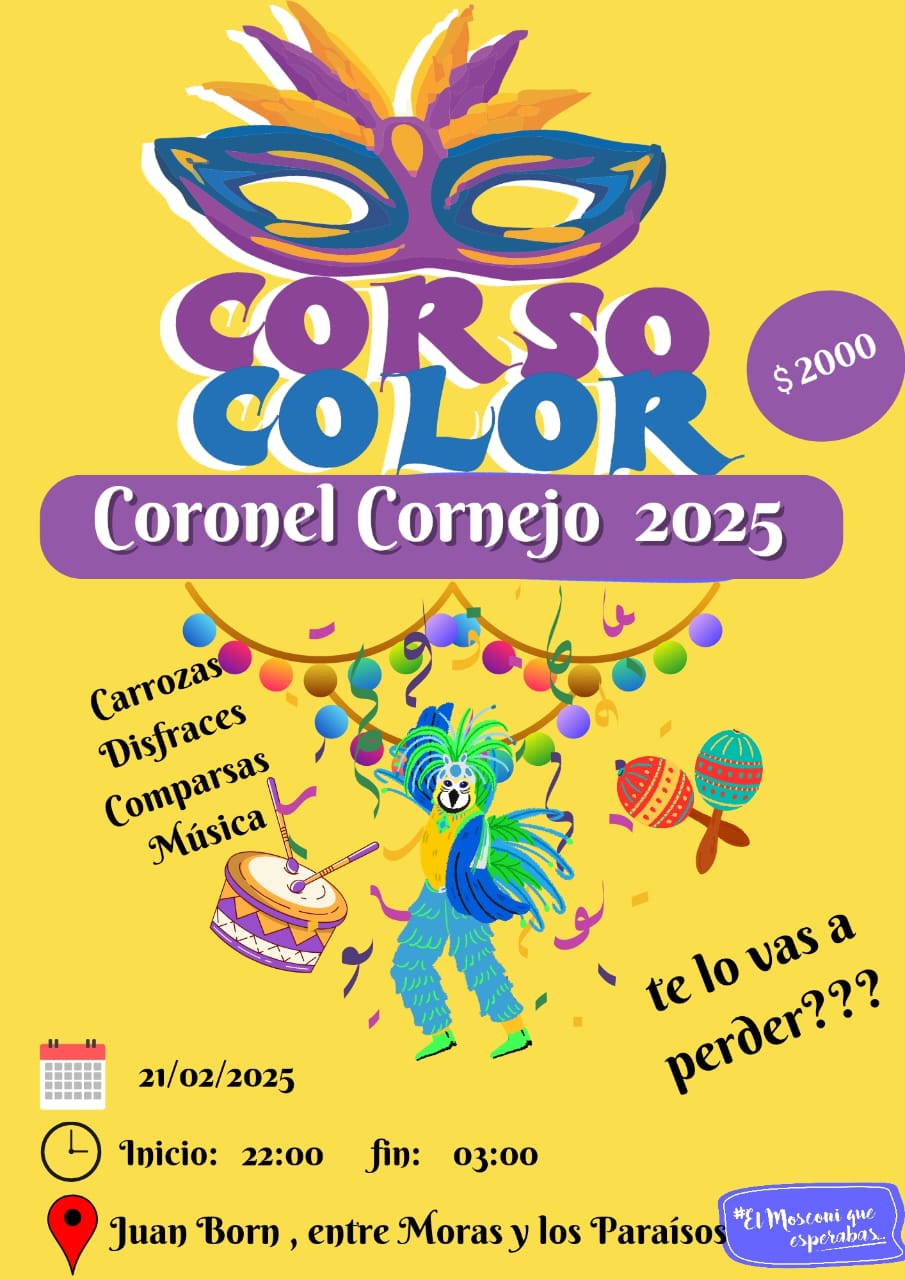 Hoy Viernes 21 de Febrero te esperamos para vivir la noche del Corso Color en Coronel Cornejo, a partir de las 22:00 Hs, en Juan Born, entre Moras y los Paraísos.