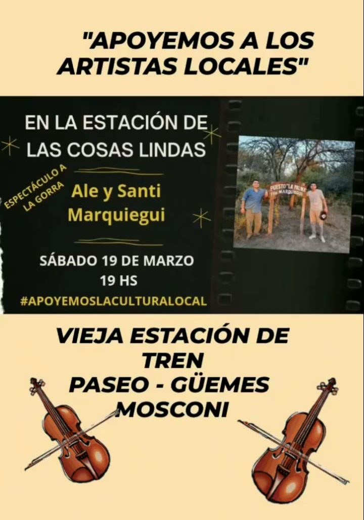 Continúan con los espectáculos «a la gorra», en esta oportunidad se presentará a «Ale y Santi Marquiegui», jóvenes de nuestro medio que estarán deleitando con su música, al público que se dará cita en este hermoso lugar. Será este sábado 19 de marzo a partir de las 19:00 horas.