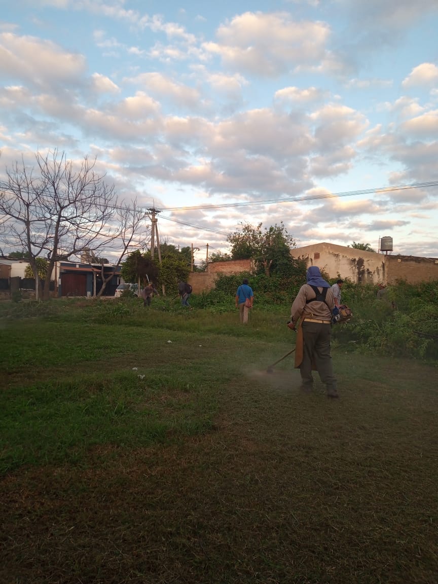 En la jornada de hoy las cuadrillas de trabajo, se ocuparon del desmalezamiento y limpieza de espacios verdes, como así también de la fumigación espacial.