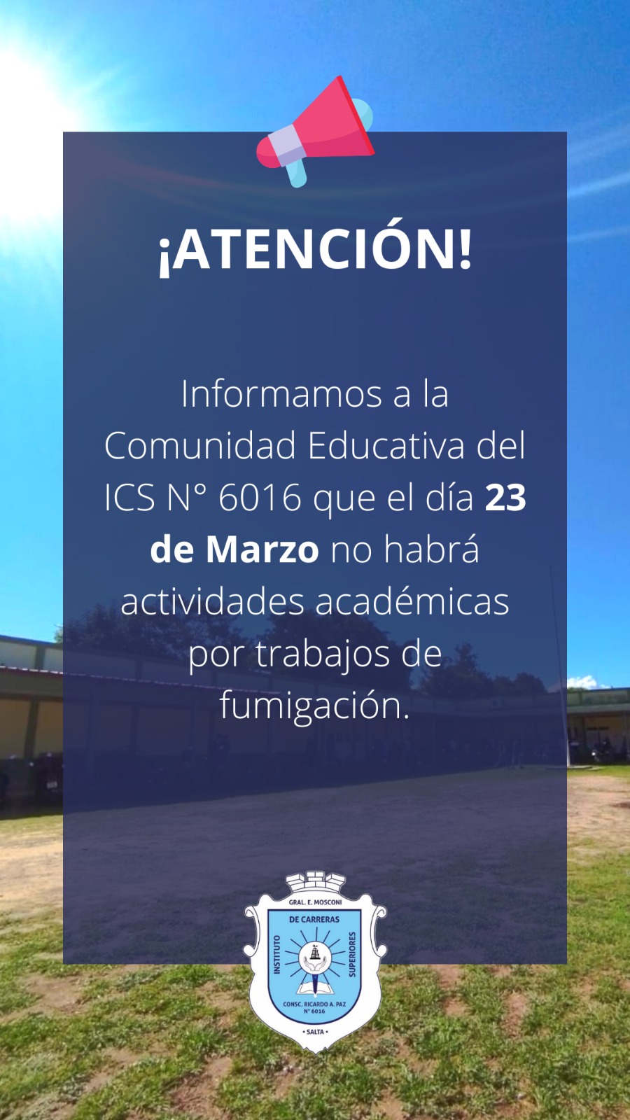 El Instituto Terciario N°6016 «Conscripto Ricardo A. Paz» de nuestra ciudad, informa que este jueves 23 de Marzo no habrá actividades académicas.