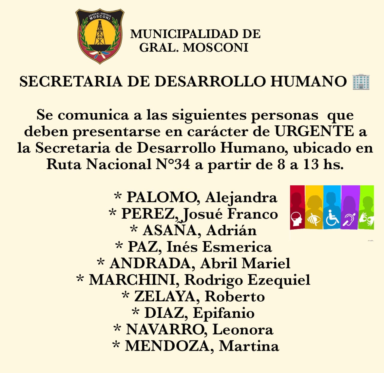 General Mosconi: Nómina de personas que deben presentarse en la Secretaría de Desarrollo Humano del municipio.