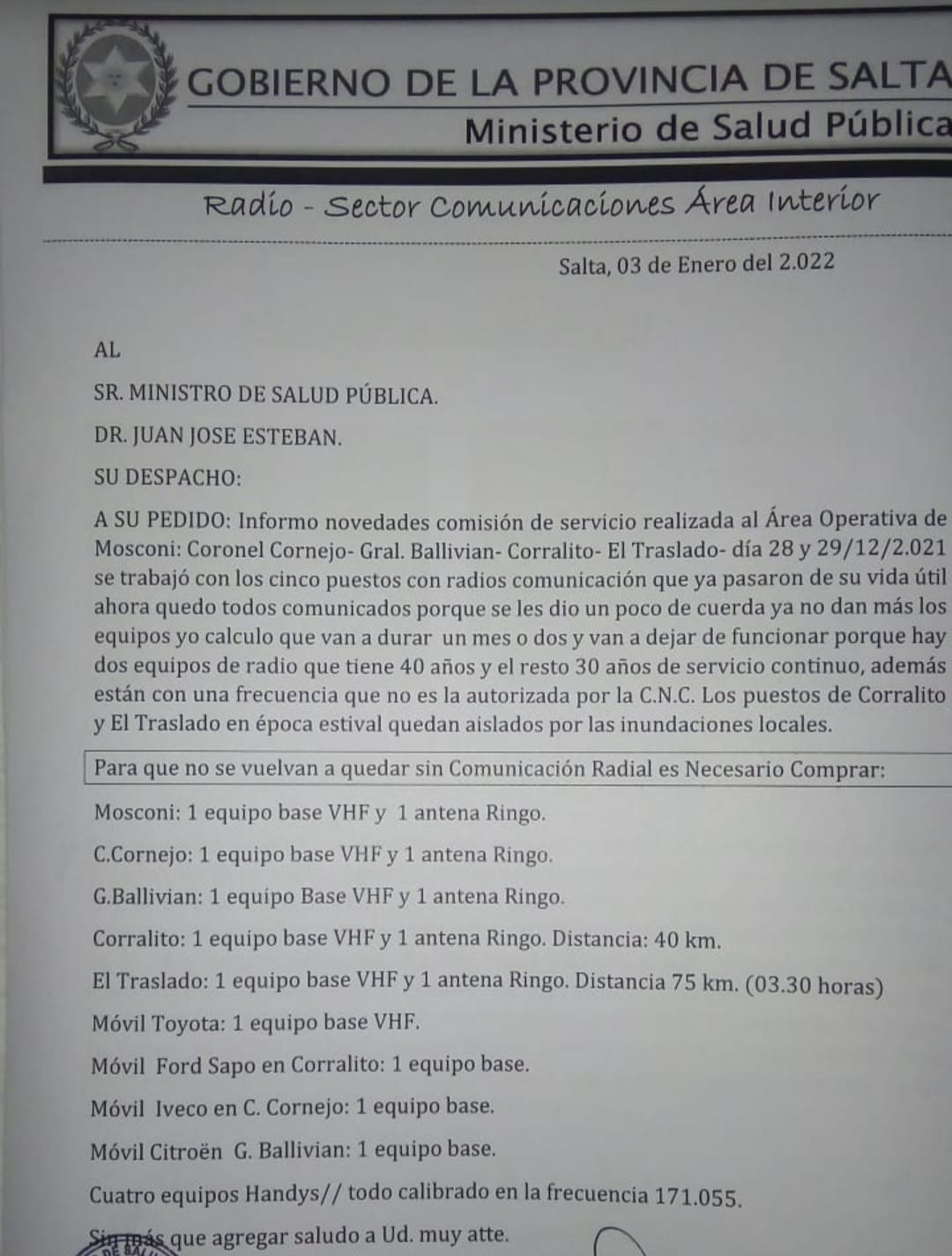 Las mismas estarán destinadas a optimizar la comunicación del nosocomio con el Centro de Salud  de Coronel Cornejo, Centro de Salud de General Ballivián y los  Puestos Sanitarios de «El Traslado» y «Corralito».