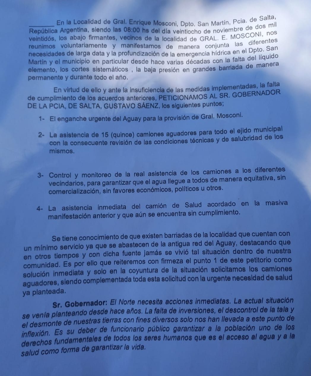 Los vecinos autonvocados por la problemática del agua de nuestra ciudad, confeccionaron un petitorio dirigido al Gobernador de nuestra provincia.