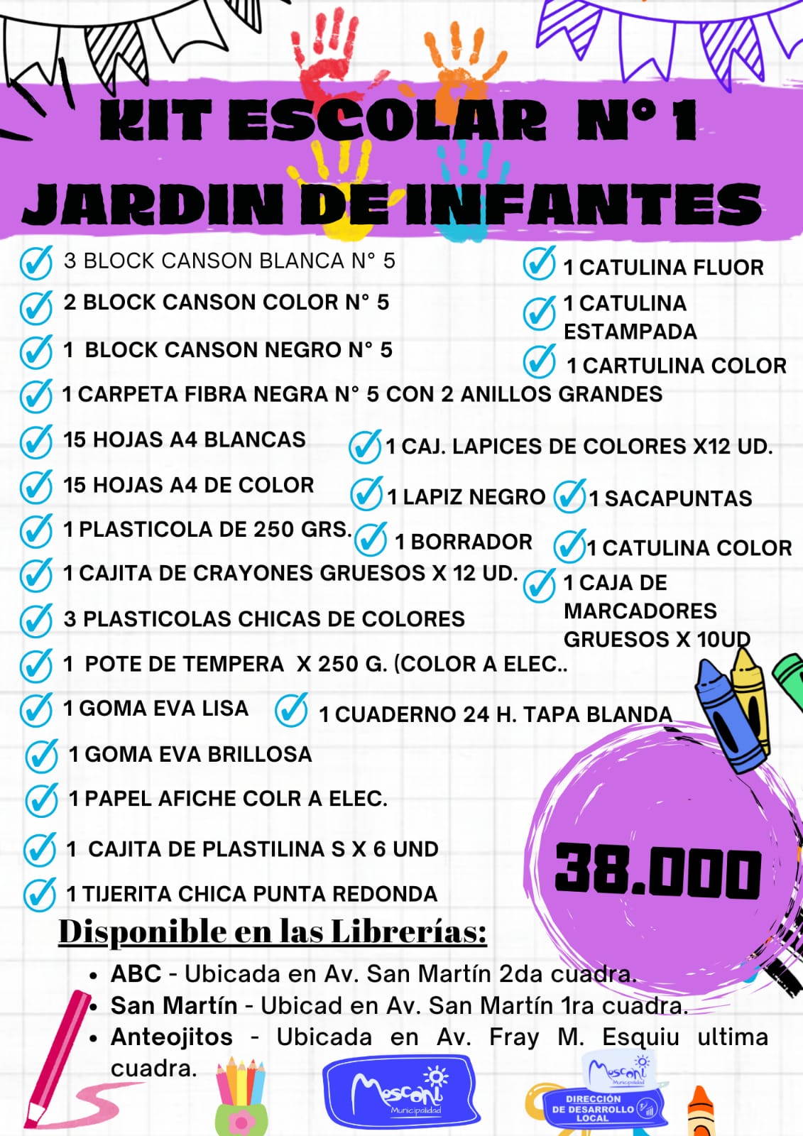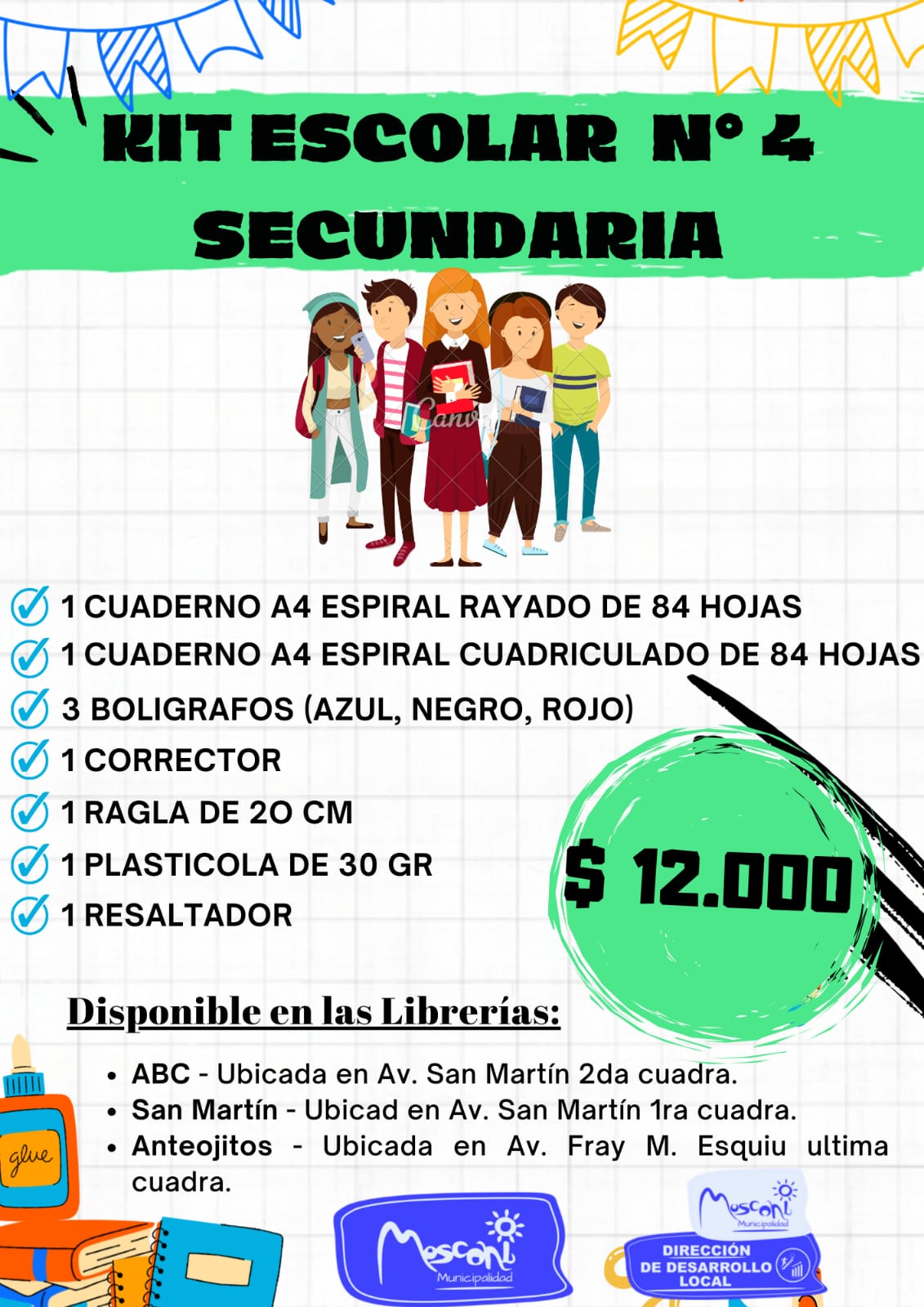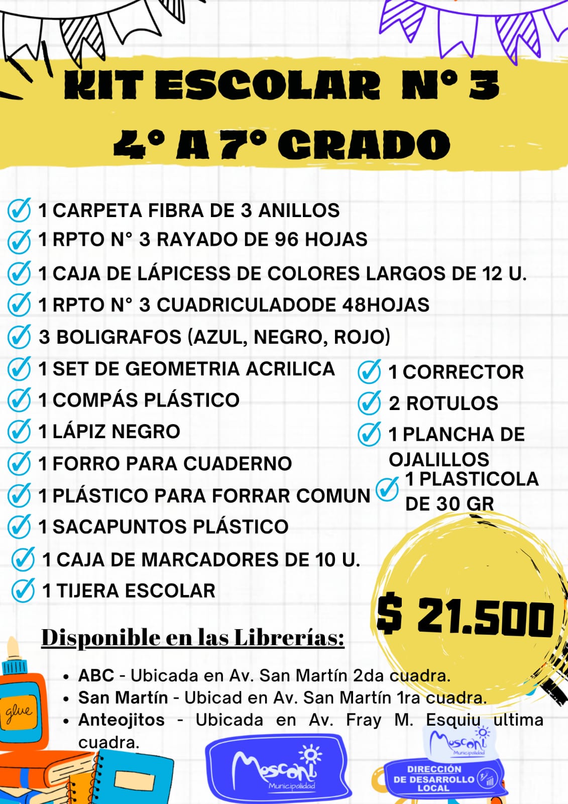 La Municipalidad de General Mosconi, en articulación con nuestros comercios locales, informa a toda la comunidad que ya se encuentran disponibles los 4 Kits Escolares en las librerías habilitadas: