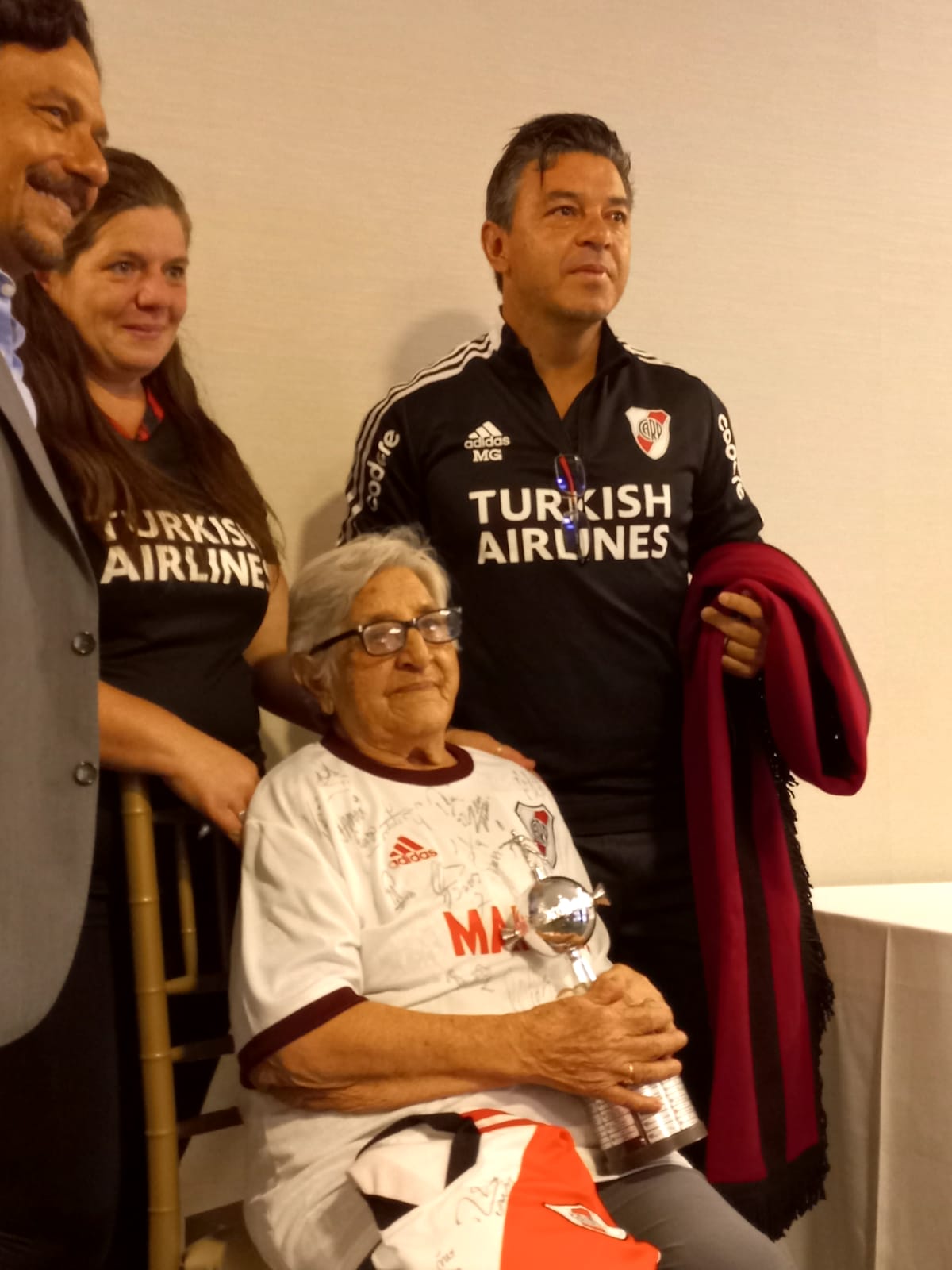 Doña Dora Montenegro de Velázquez, cumplió su sueño: Conocer al DT de River, Marcelo Gallardo y a los jugadores de su equipo favorito.