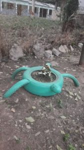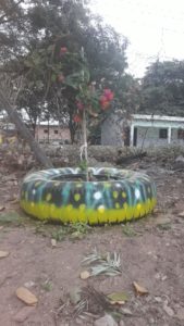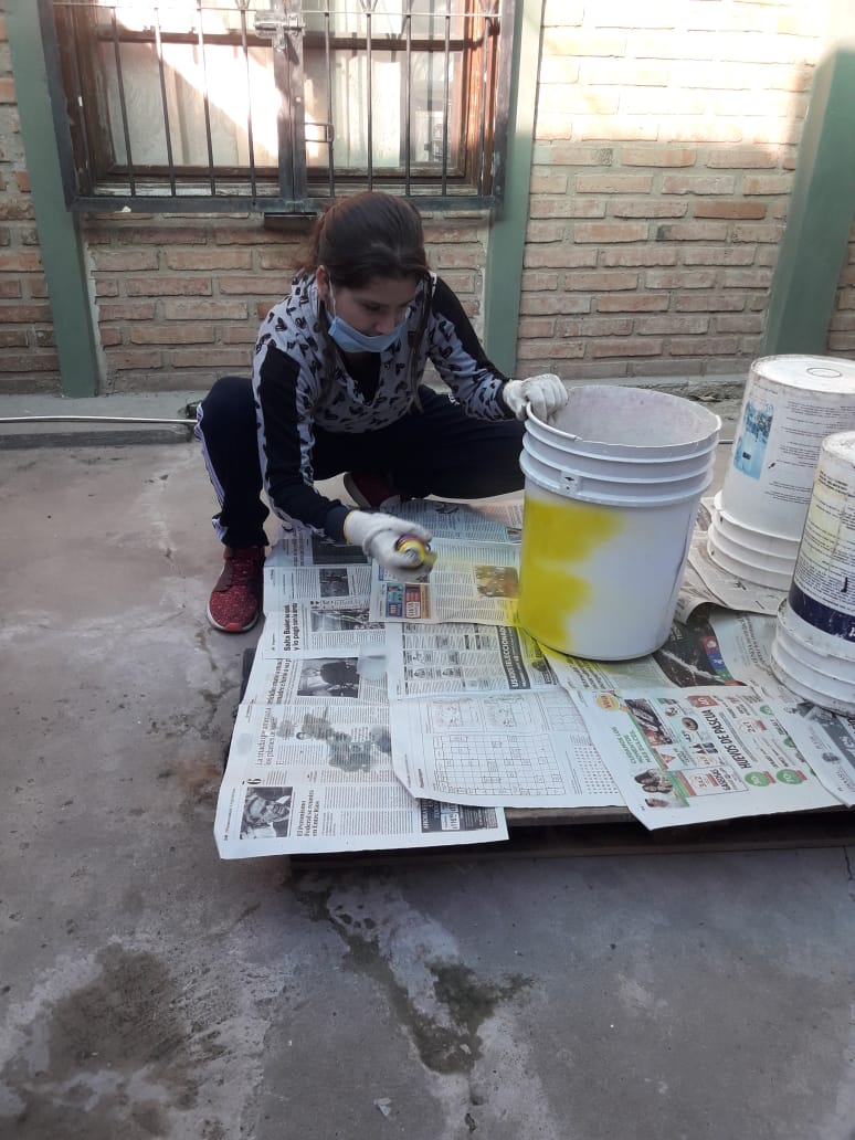 La familia en pleno, comenzó con la limpieza de la vereda de la Escuela Especial «Nichilen» y con el trabajo de Ariadna (el reciclaje de los neumáticos) pusieron plantines y los protegieron con los mismos ya decorados. Sacaron las malezas que cubrían parte de los laterales de la Institución, dejándola transitable.