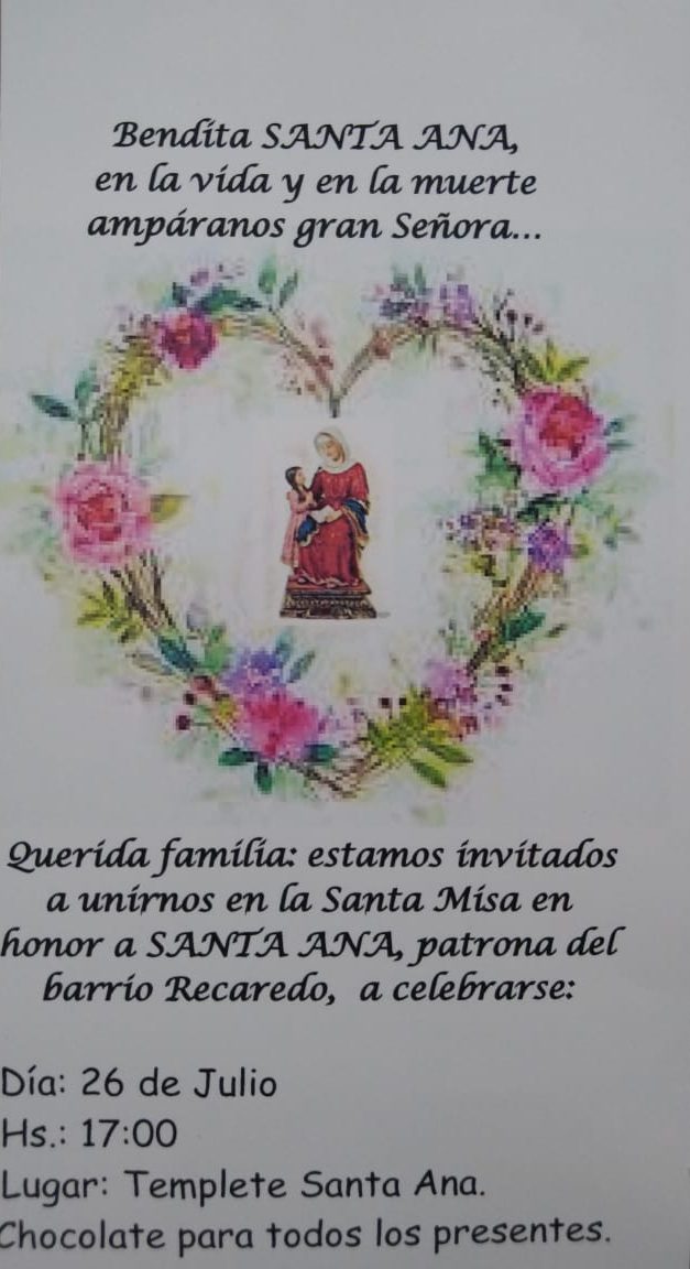 Se realizará la santa misa en honor a «Santa Ana» donde participarán los vecinos y luego se servirá un chocolate para todos los presentes.