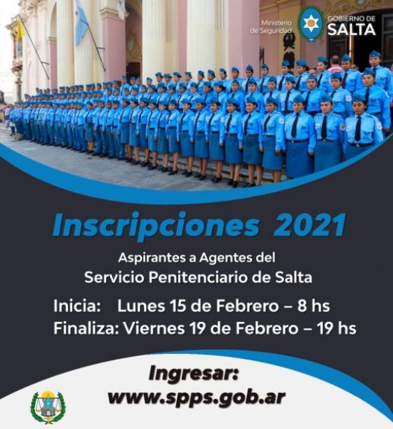 El Servicio Penitenciario de Salta informa que desde hoy 15 de febrero desde las 8 horas se abrirán las inscripciones para el Centro de Formación de Aspirantes a Agentes de la institución que se extenderá hasta el viernes 19 de febrero a las 19 horas.