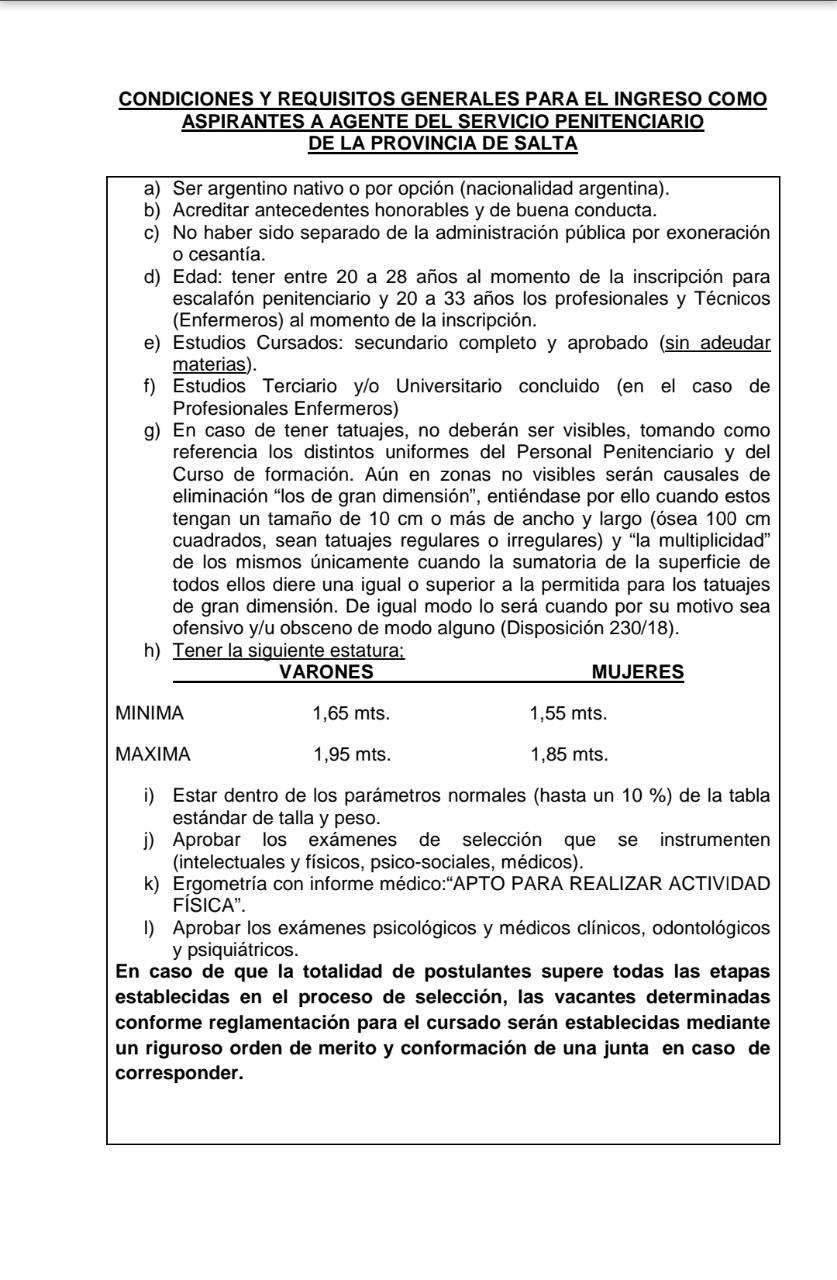 Cabe destacar que los aspirantes deben ser argentinos nativos o por opción; tener entre 20 y 28 años de edad para el escalafón penitenciario; entre 20 y 33 años profesionales y técnicos en enfermería; secundario completo; título habilitante en el caso de los profesionales; entre otros requisitos.