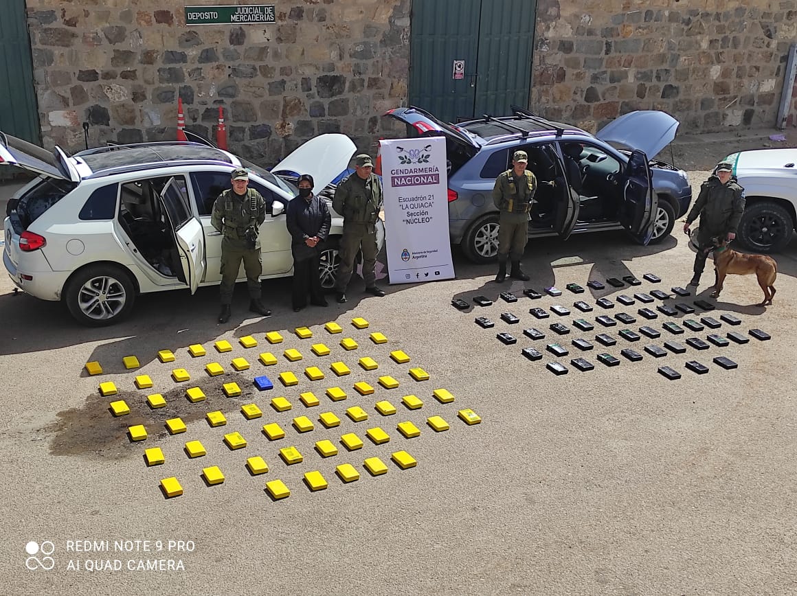 Allí, al profundizar el registro, con el apoyo del can detector de narcóticos, los uniformados detectaron en el piso y baúl de ambos rodados 118 paquetes rectangulares que contenían 123 kilos 576 gramos de cocaína oculta bajo la modalidad “envainados”.