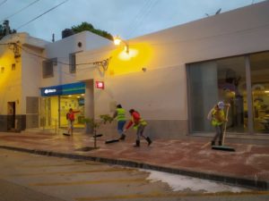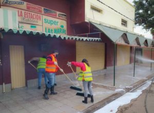Ayer en horas de la tarde Personal Municipal con la colaboración de Bomberos Voluntarios procedieron a la limpieza y desinfección de Veredas, Supermercados, Comisarias , Bancos y el Hospital Juan Domingo Perón.