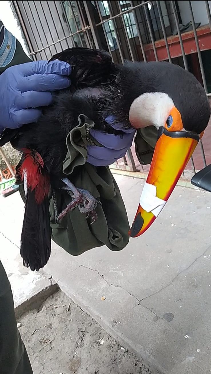 Más tarde, los funcionarios trasladaron al ejemplar de la especie “Ramphastos Toco”, hasta la fundación “Patitas en la Calle”.