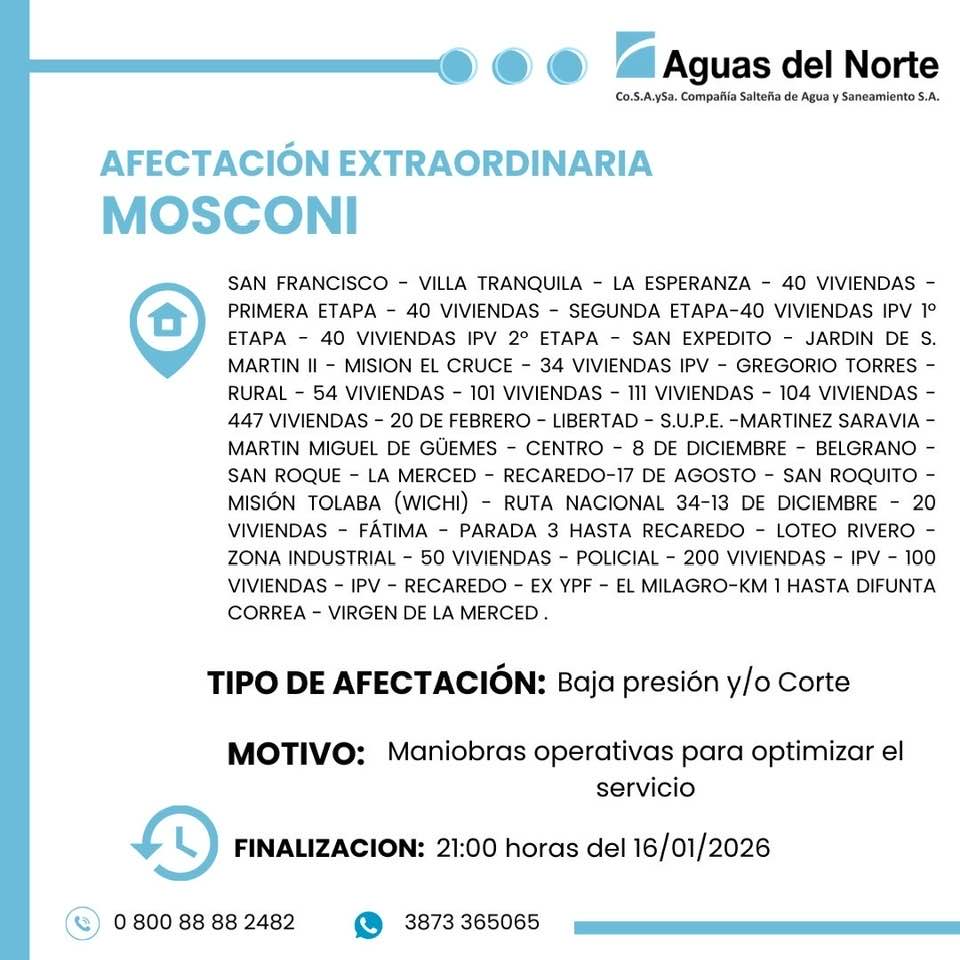 General Mosconi: Recomendación de la Empresa Aguas del Norte por la falta de agua en la ciudad.
