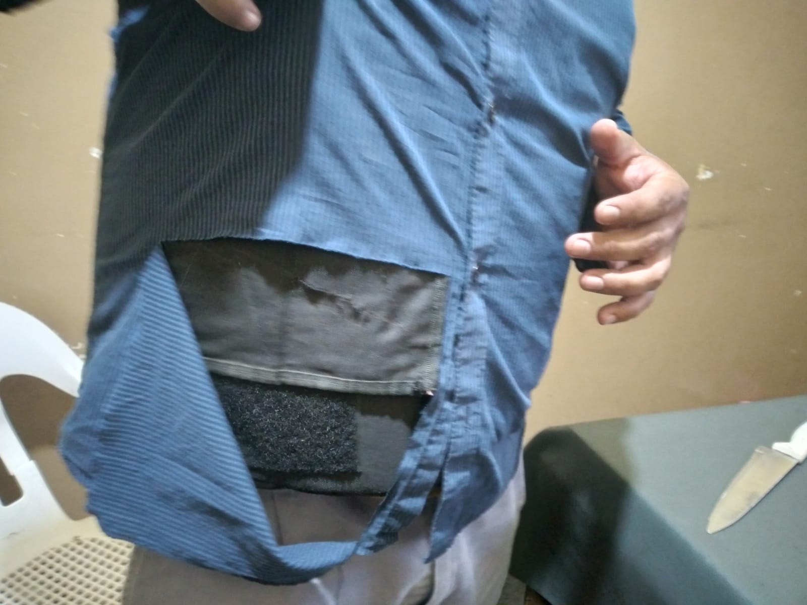 En el momento en el que fue alcanzado por uno de los miembros de la fuerza de seguridad y sin mediar palabras, comenzó a arrojarle varias estocadas con un arma blanca, que lograron desgarrarle la camisa e incrustar una de ellas en el chaleco antibalas que salvó al policía de una herida que podría haber sido mortal.