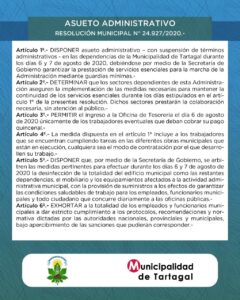 El articulo 1° señala: «DISPONER asueto administrativo con suspensión de términos administrativos en las dependencias de la Municipalidad de Tartagal durante los días 6 y 7 de agosto de 2020, debiéndose por medio de la Secretaría de Gobierno garantizar la prestación de servicios esenciales para la marcha de la Administración mediante guardias mínimas.»