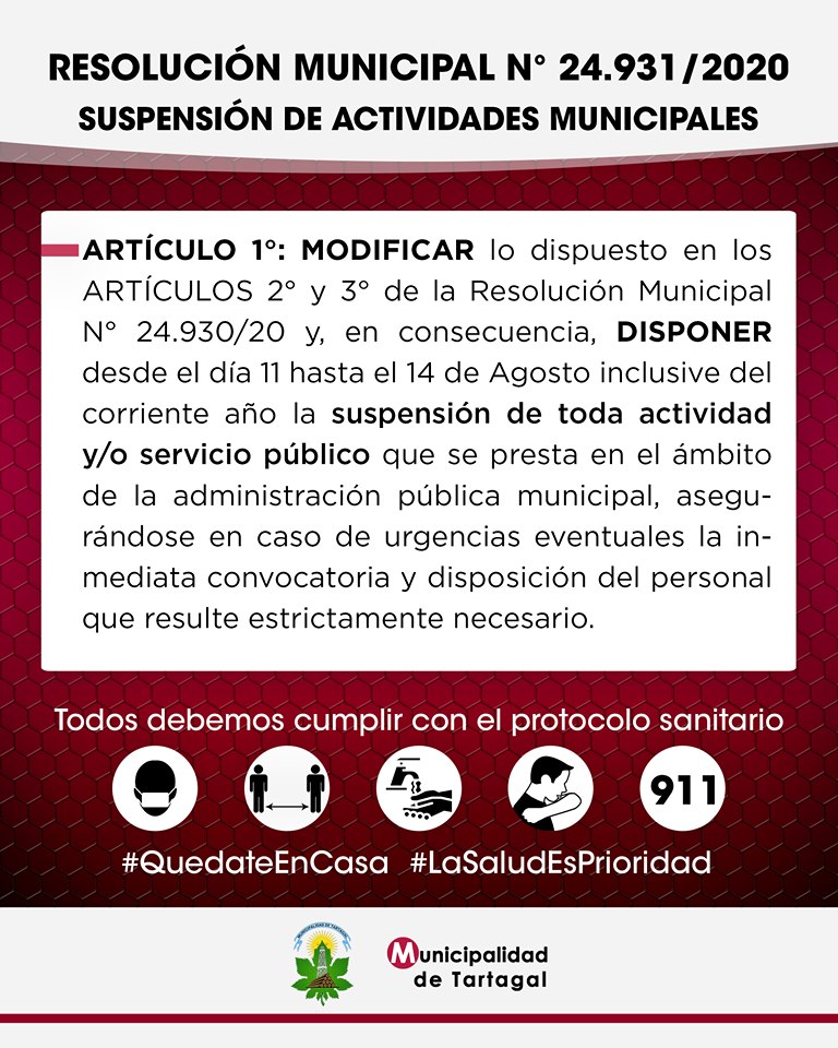 RESOLUCIÓN MUNICIPAL N° 24.931/2.020: SUSPENSIÓN DE ACTIVIDADES MUNICIPALES
