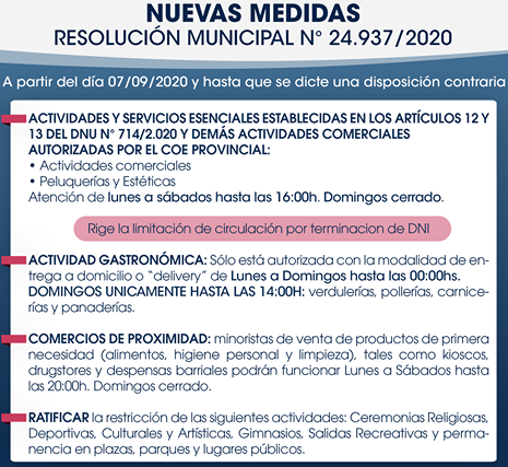 El Intendente Mario Mimessi anunció las nuevas medidas y habilitación de actividades comerciales, que regirán a partir del día Lunes 07 de Setiembre.